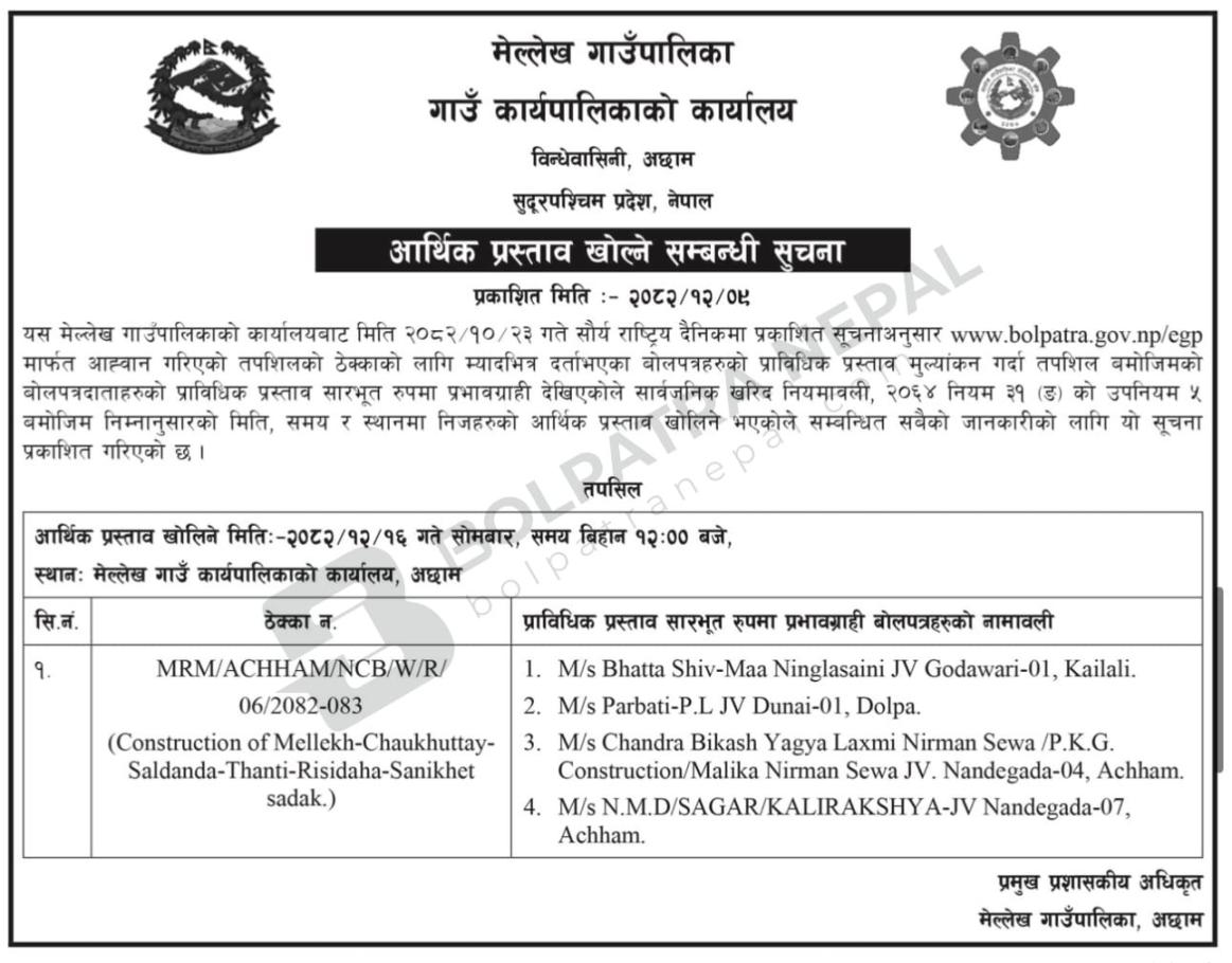 बोलपत्रको आर्थिक प्रस्ताव खोल्ने सम्बन्धि सुचना मेल्लेख-चौखुट्टे-सालडाँडा-ऋषिदह-सानिखेत सडक